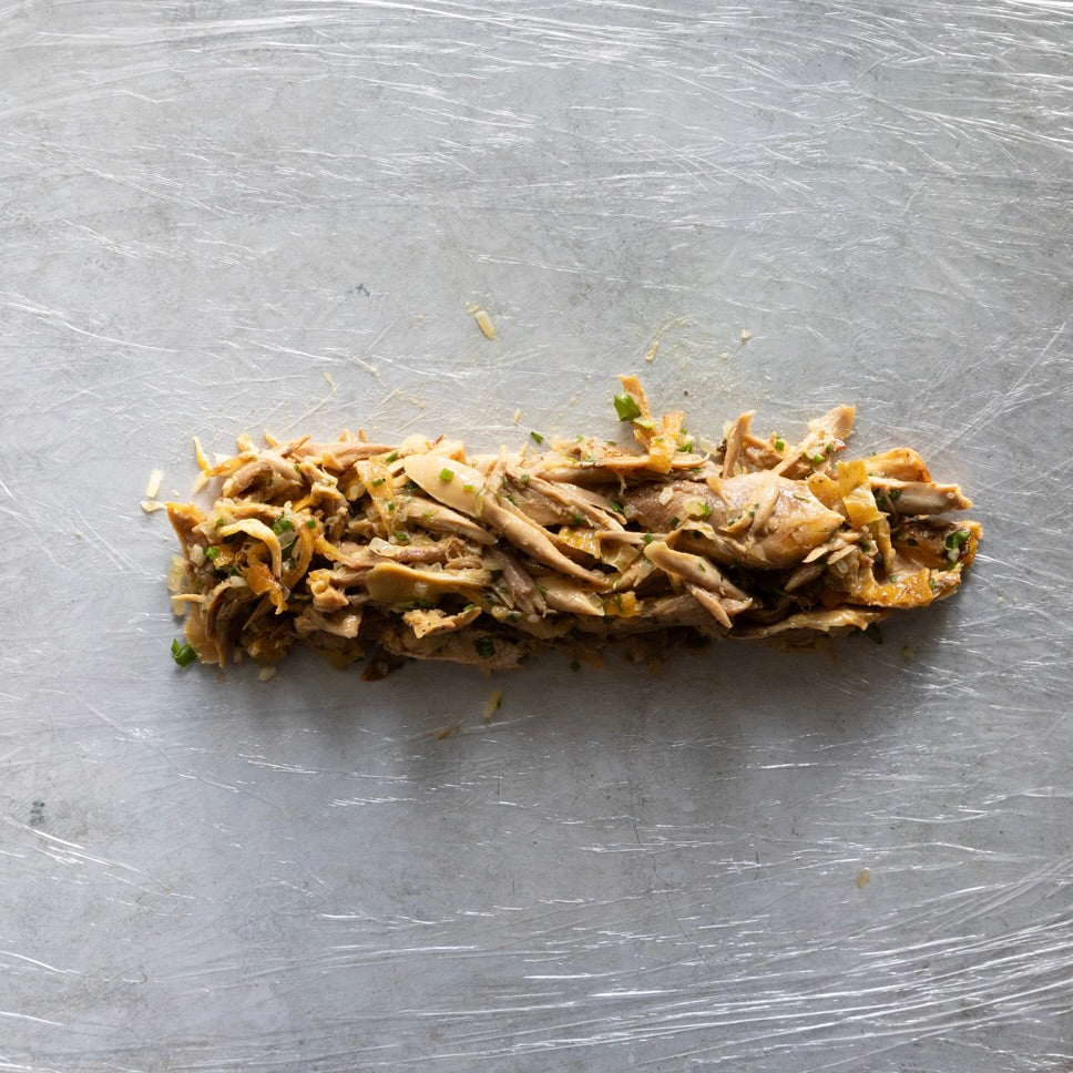 While still warm, remove the skin from the legs and set aside. Pick all the meat off the bones and break any large pieces into smaller ones. Mix this meat with the cooled onion mixture. Chop the reserved skin and add it in. Keep the mixture warm, as it won't bind properly if cold. Check and adjust seasoning to taste.