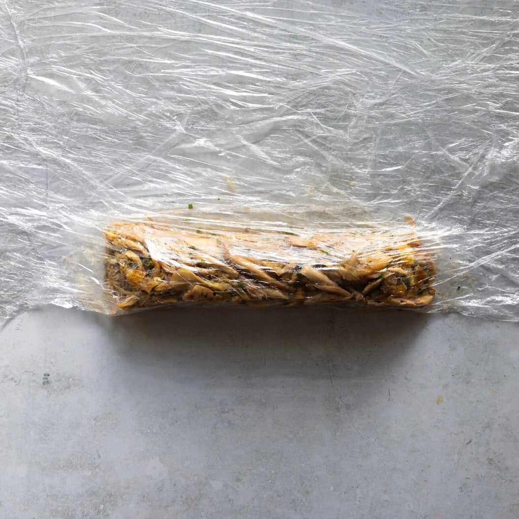 Roll the mixture as you would sushi, pausing after each quarter turn to maintain a uniform shape. Watch the thickness - if the ballotine starts becoming too thin, use the sides of your hands to gently push inwards from each end..