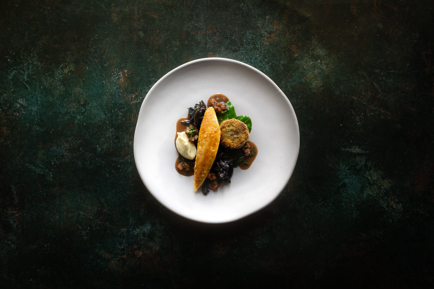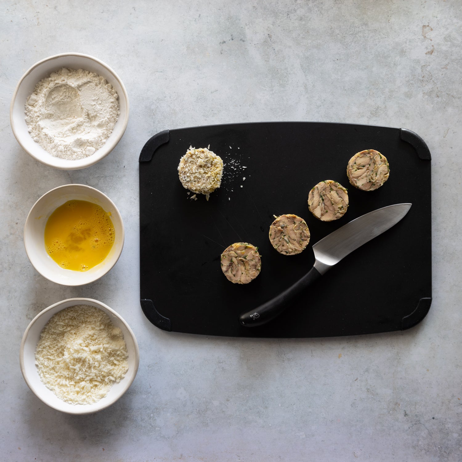 For a crispy garnish to accompany your roast chicken breast, the chilled ballotine can be sliced, crumbed and fried.