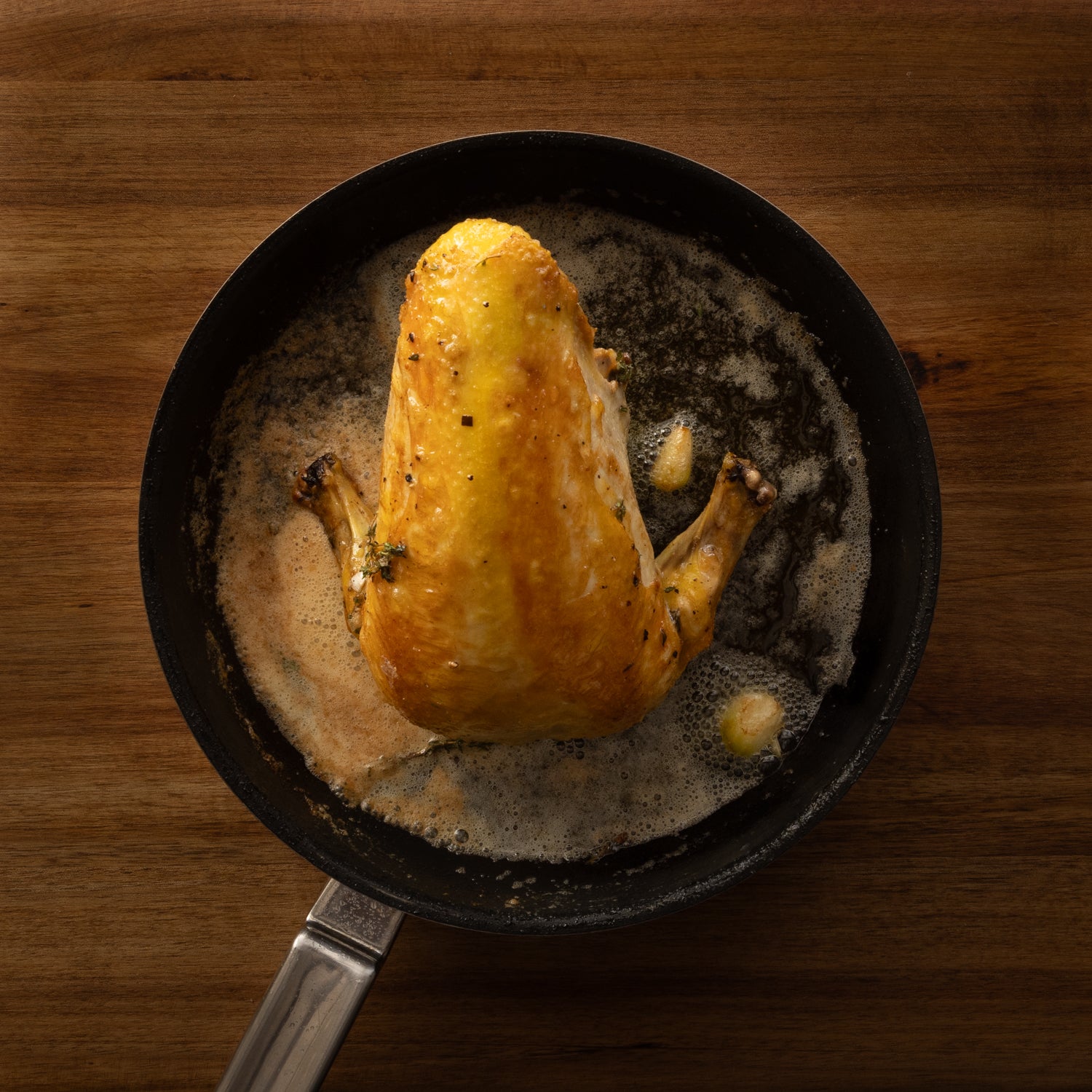 Once golden, add 100g diced butter, a thyme sprig, and one garlic clove. As the butter begins to foam, use a spoon to baste the crown with the buttery juices to enhance colour and flavour.