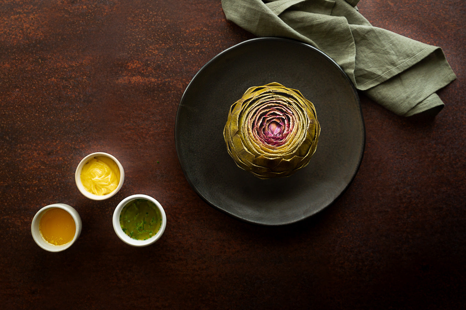 Put the base of the leaf between your teeth and pull to enjoy the soft artichoke flesh. When you get to the fibrous base, carefully remove and discard it, leaving the ‘heart’ base which is also delicious eaten with the dips.