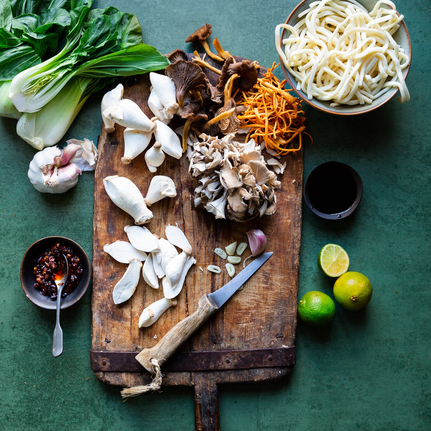 Fry the Fresh Mushroom Mix and Baby King Oyster Mushrooms for 3-4 minutes or until lightly coloured. Add the Cordyceps, garlic and chilli flakes and stir, cooking for another minute.