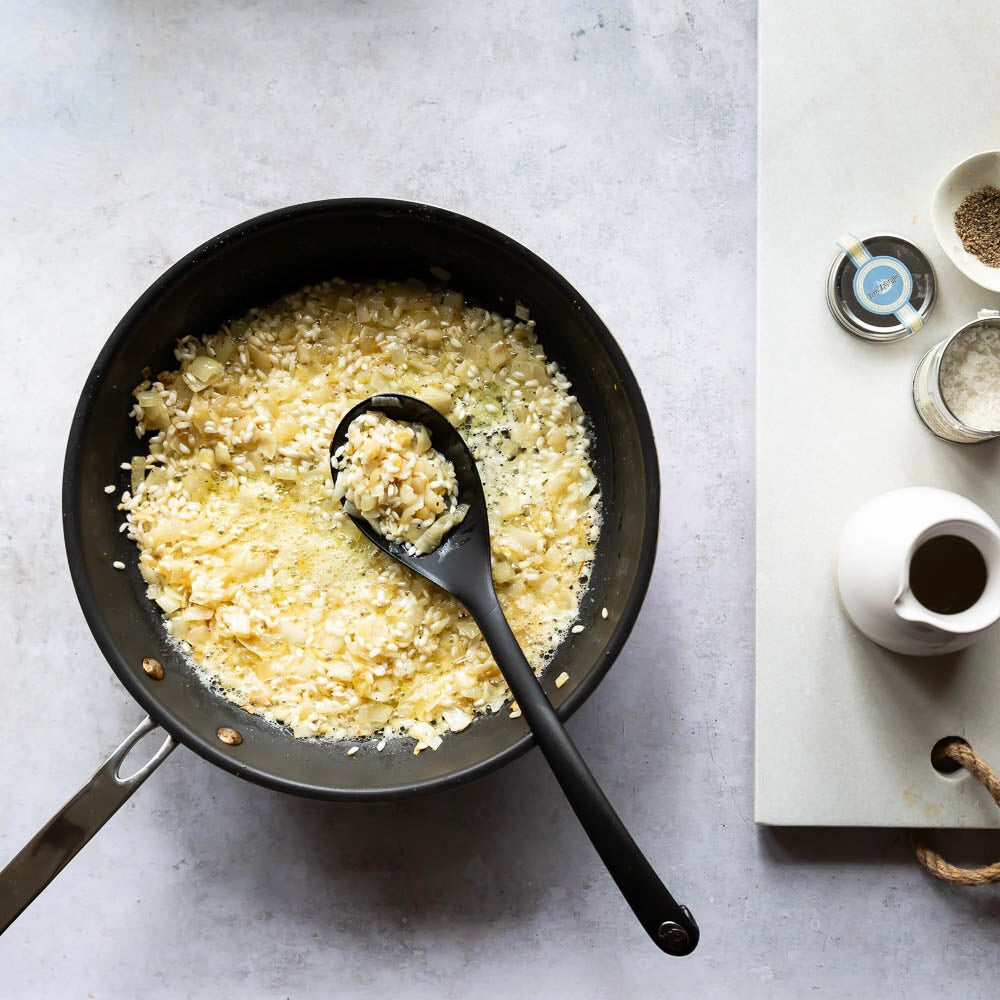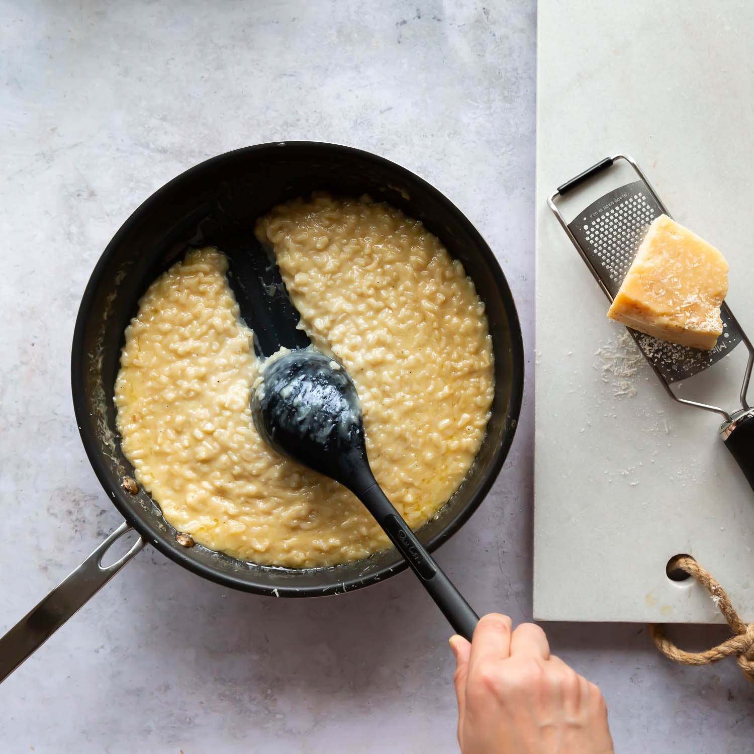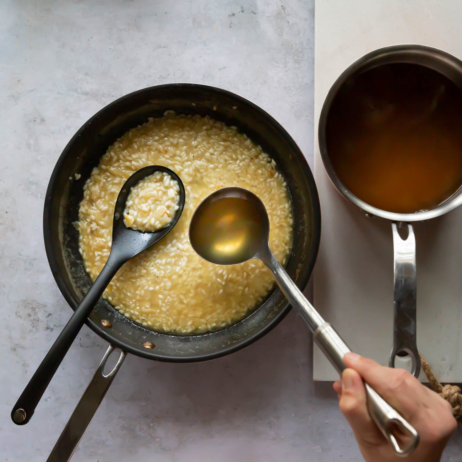 A great risotto should have a slight bite to it, be luxurious, creamy, and gently fall outwards on the plate but not collapse. Adding the stock gradually allows more stirring for the starches to be released from the rice, creating the lovely creamy consistency you are looking for.