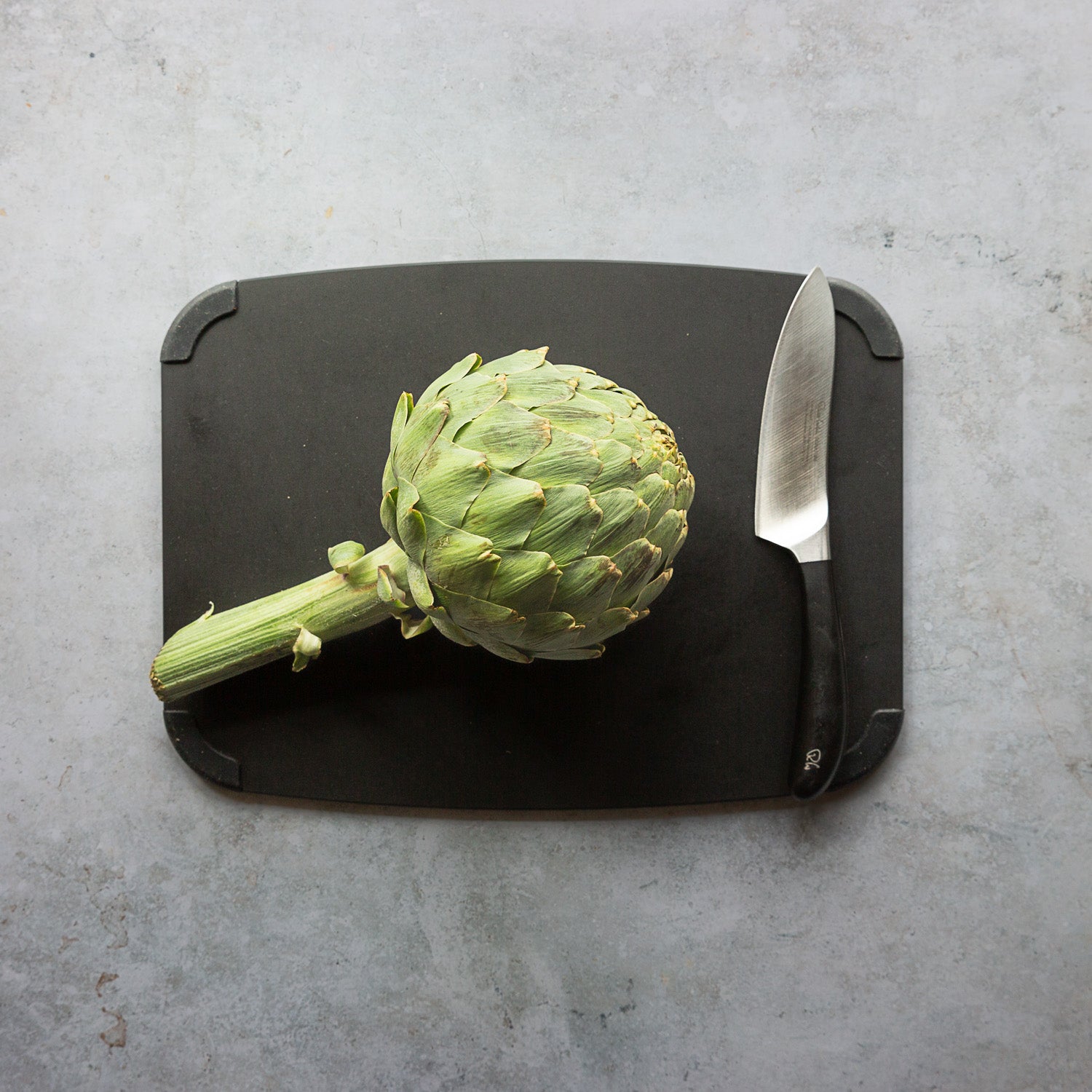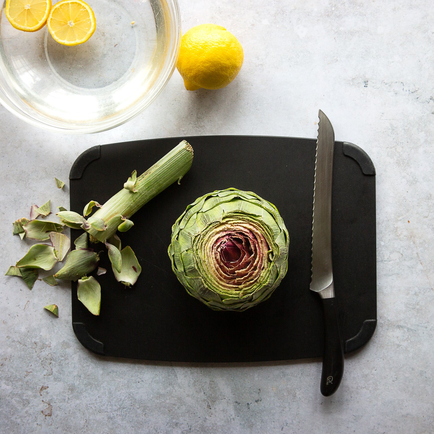 Using a serrated bread knife slice 3/4 inch off the tip of the artichoke.