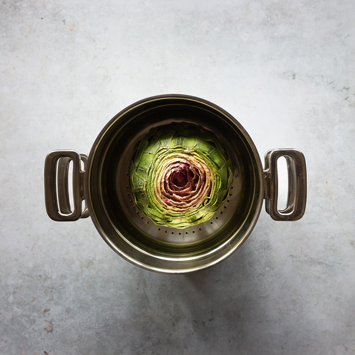 The artichoke will take anywhere from 30 minutes to an hour to steam depending on the size. Start testing at 30 minutes to see if it is cooked by gently pulling one of the inner leaves. It should come away easily. If there is resistance then test again in another 10 minutes. When cooked remove from the heat and allow to cool slightly for 15 minutes.