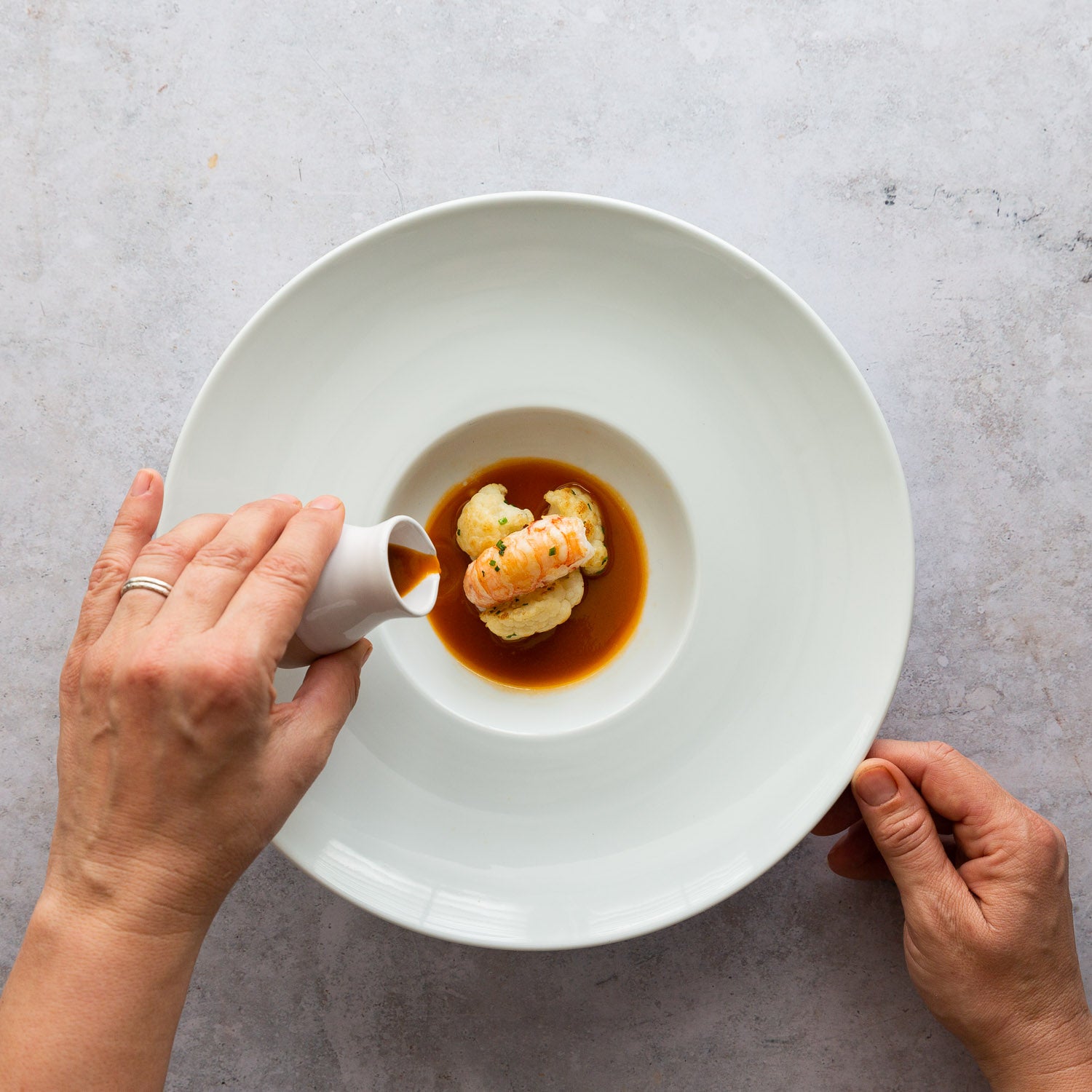 Arrange a few cauliflower florets in the base of 4 warmed bowls and place the langoustine tails on top. Pour the bisque in the side of each bowl and serve with warm crusty bread.