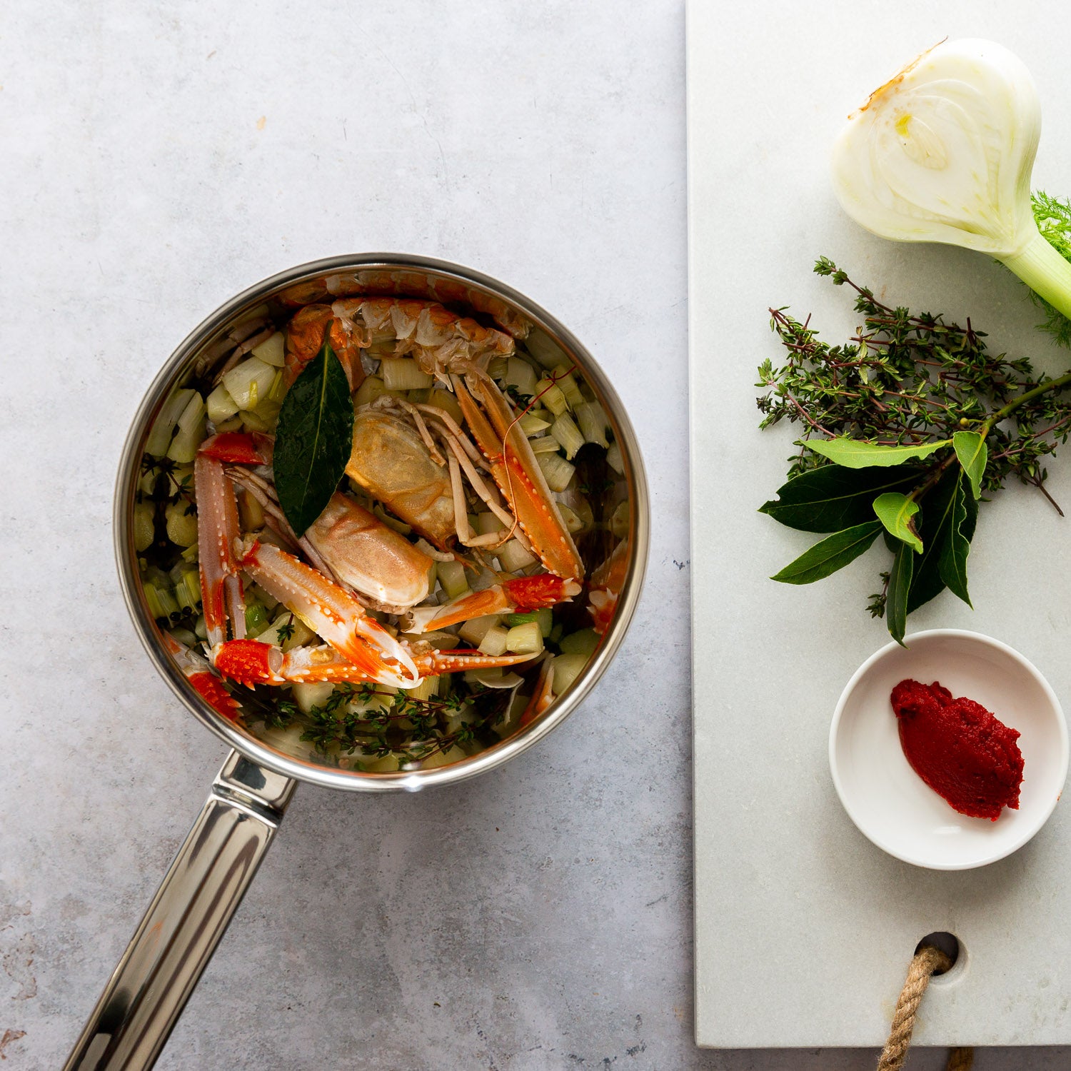 Roughly chop the onion, garlic, fennel, leek and celery, and sweat down in a large heavy-based pot with a good splash of olive oil and seasoning, thyme and bay.