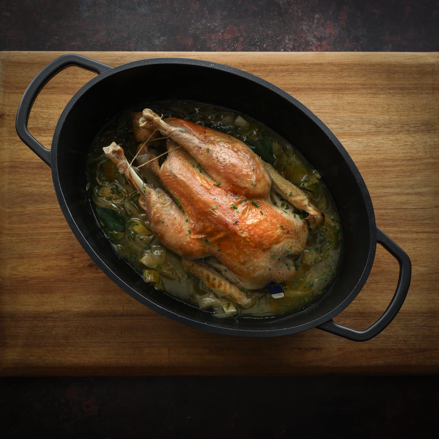 Unlike roasting, pot-roasting captures the complex flavours from the bird's prestigious terroir and blue feet in a natural sauce. The enclosed, moist cooking environment consistently achieves optimal results, transforming this protected French delicacy into a dish that fully expresses its heritage and exceptional quality.