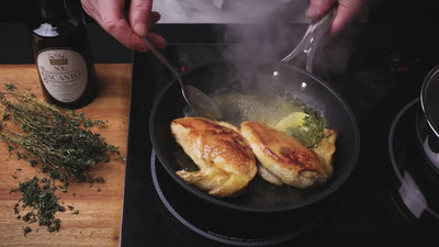 The supremes are cut with the skin on, which is essential to the cooking method: started skin-side down in a cold pan, the skin renders slowly and crisps to a deep golden colour while the breast cooks gently from the underside. The fat layer from the maize-and-milk finishing means the skin crisps exceptionally well — better than almost any other chicken breast you will cook.